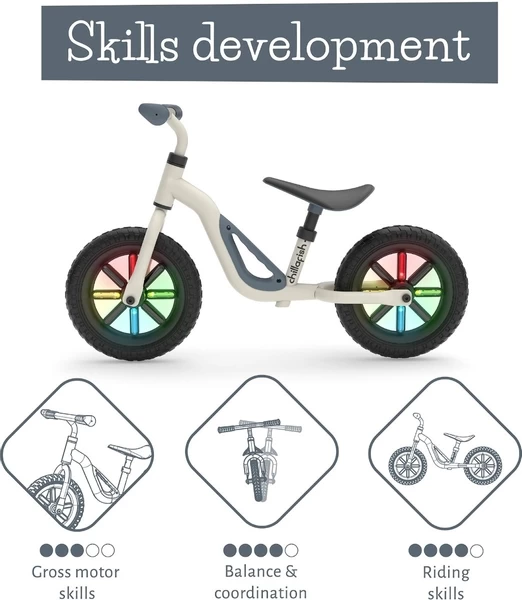 De Chilafish Charlie loopfiets groeit met de kids mee. Het zadel is namelijk verstelbaar in verschillende hoogtes vanaf 28 tot 37 cm. Daarnaast groeit ook het stuur mee. Deze is verstelbaar tussen de 48 en 51 cm. Zo zit jouw kindje altijd comfortabel op de loopfiets.